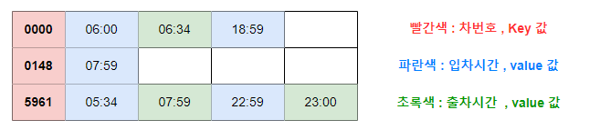 먼저 records[ ] 에서 차번호만 Arraylist 1에 담아 차번호순으로 정렬을 해놓는다. 그리고 HashMap<String, ArrayList<String>> 에 records[ ] 의 차번호를 key값, 출입시간을 value( Arraylist ) 에 담는다. 이 때 IN , OUT는 신경쓰지 않는다. HashMap<String, ArrayList<String>> 의 ArrayList에 짝수인덱스 ( arr[0] , arr[2] ... )은 입차시간 기록이고